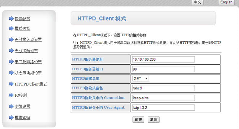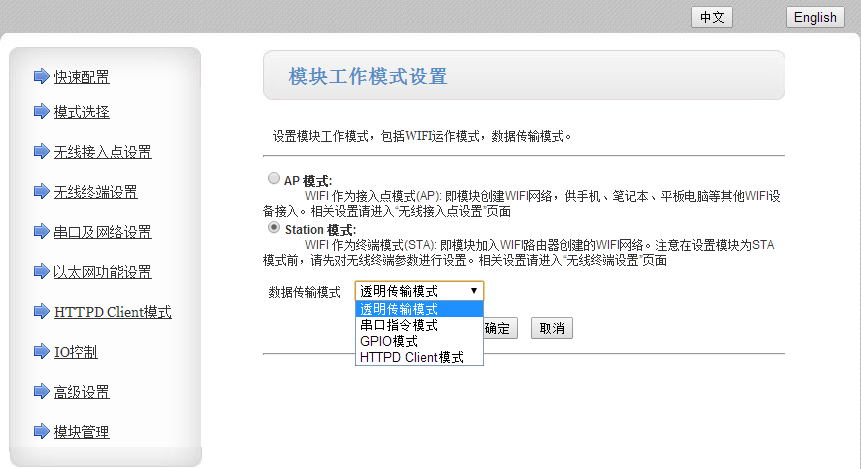 3:數(shù)據(jù)傳輸方式支持:透?jìng)髂J剑ㄒ话阃ㄐ欧绞綖橥競(jìng)?,不理解最好不要選擇),串口指令,GPIO模式,HTTPD client(網(wǎng)頁(yè)頁(yè)面可以設(shè)置請(qǐng)求方式)