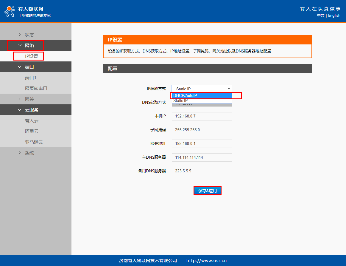 9、N510在“網(wǎng)絡(luò)”>“IP設(shè)置”界面中配置本機(jī)ip設(shè)置中,可以配置DHCP自動獲取或者設(shè)置靜態(tài)ip, 本案例配置為DHCP自動獲取IP,若需要配置510靜態(tài)IP上網(wǎng)的話可以自行設(shè)置靜態(tài)ip(Static IP)。
