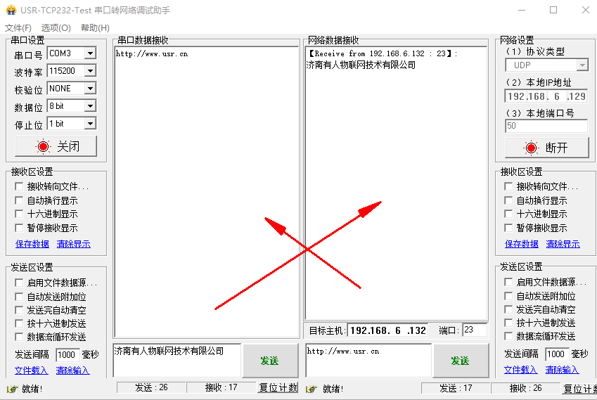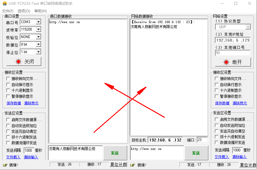 點(diǎn)擊連接,有連接對(duì)象之后,測(cè)試串口和網(wǎng)絡(luò)之間的數(shù)據(jù)傳輸。