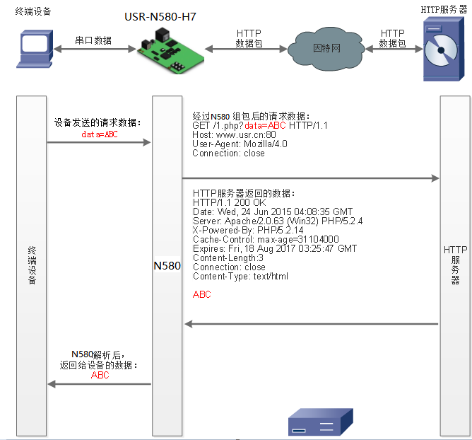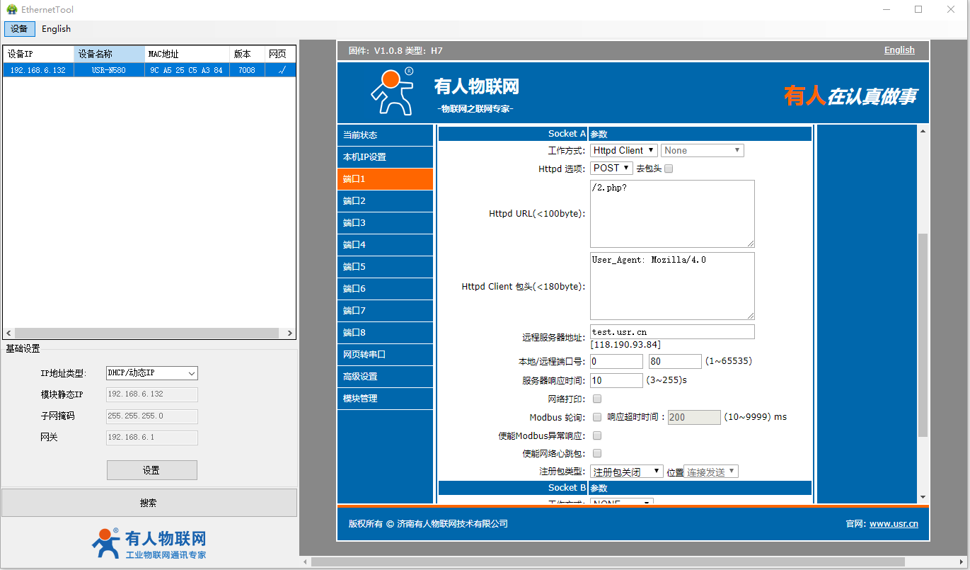 N580端口1工作方式設(shè)置HTTPD模式,POST,遠(yuǎn)程服務(wù)器地址填test.usr.cn,遠(yuǎn)程端口填80,本地端口號設(shè)置為0。URL填/2.php?,不濾除報(bào)頭。