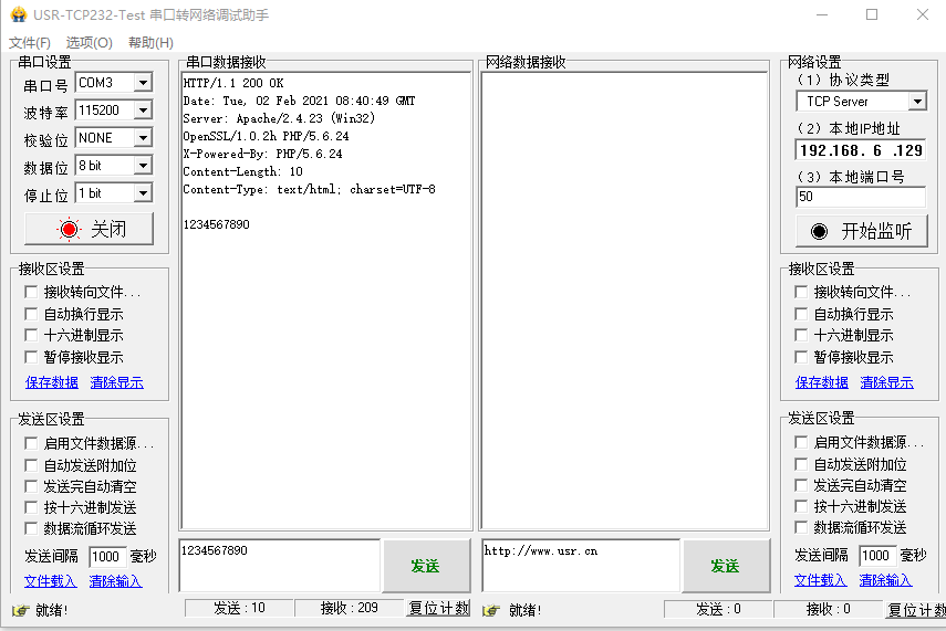 打開串口網(wǎng)絡(luò)助手,串口參數(shù)和N580 端口1參數(shù)保持一致,串口發(fā)送數(shù)據(jù)1234567890,測試服務(wù)器返回?cái)?shù)據(jù)。