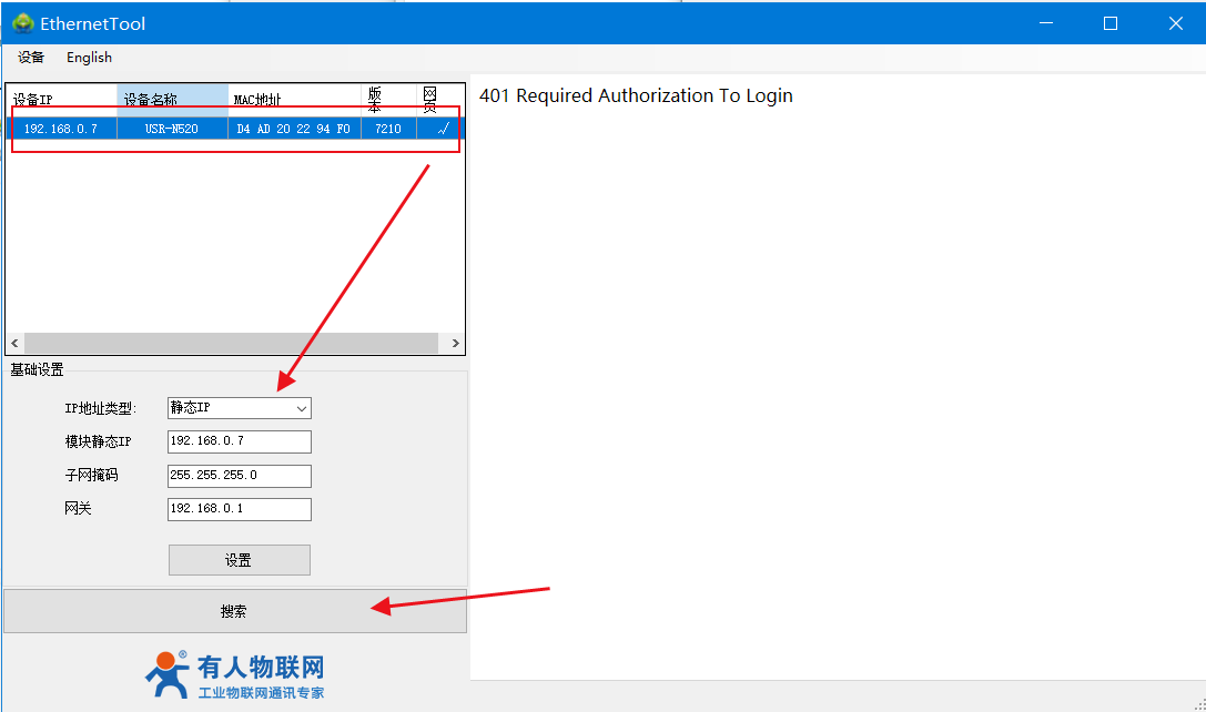 3、打開H7設(shè)置軟件,點(diǎn)擊搜索設(shè)備,點(diǎn)擊選中,可以看到IP地址為靜態(tài)IP。