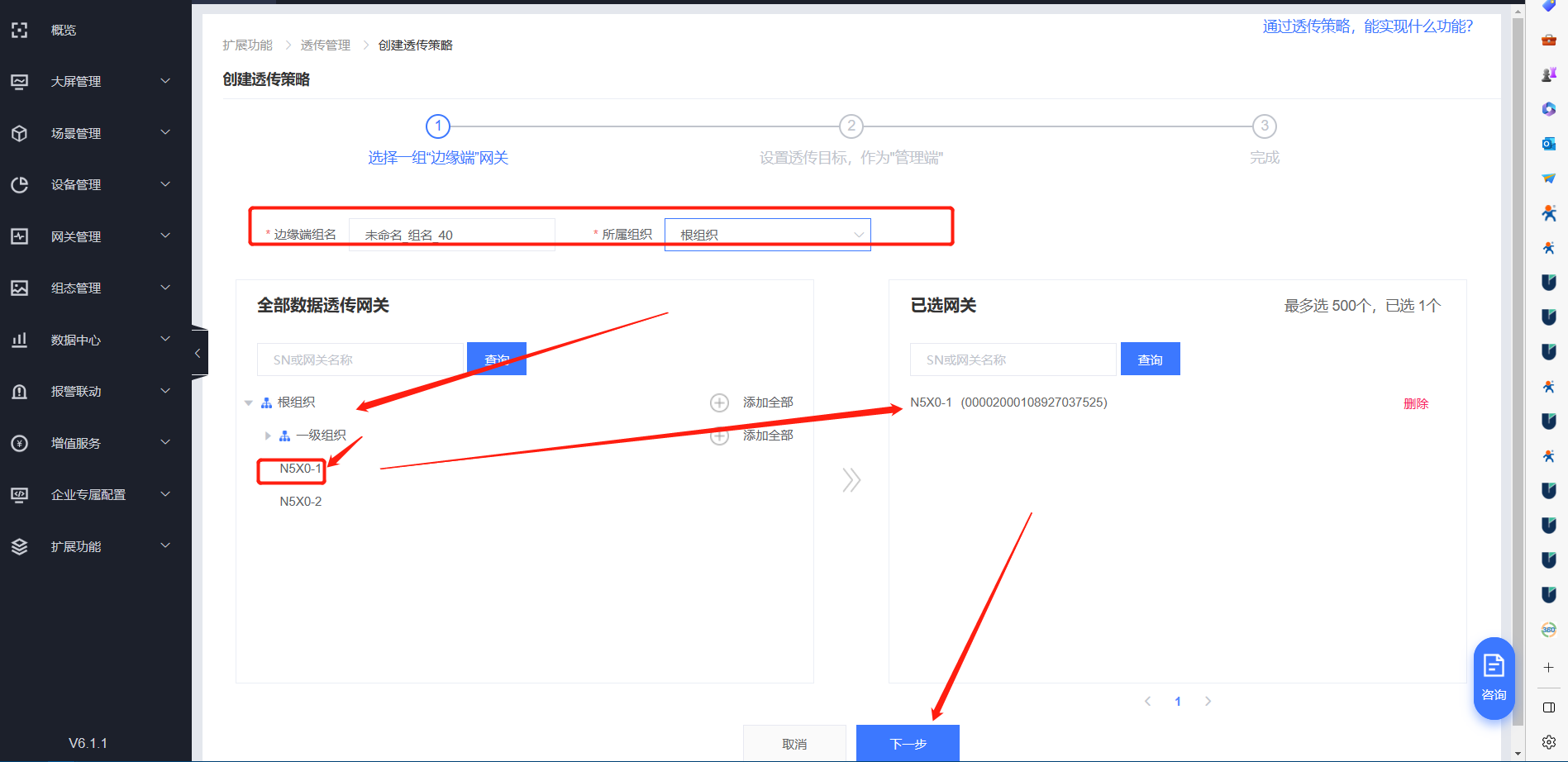 7、點(diǎn)擊“擴(kuò)展功能”---“透傳管理”---“創(chuàng)建透傳策略”