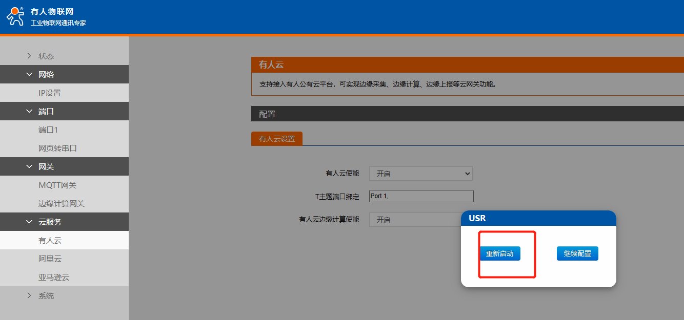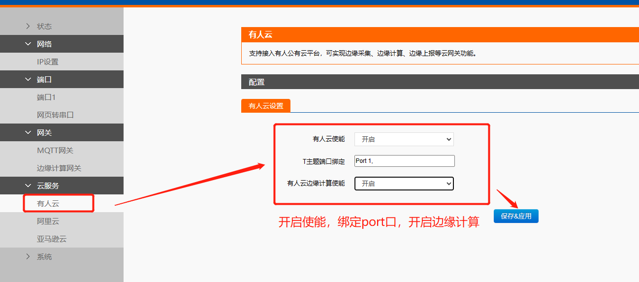4、開啟有人云使能,并綁定port端口,開啟邊緣計(jì)算使能,保存參數(shù),重啟N5X0。