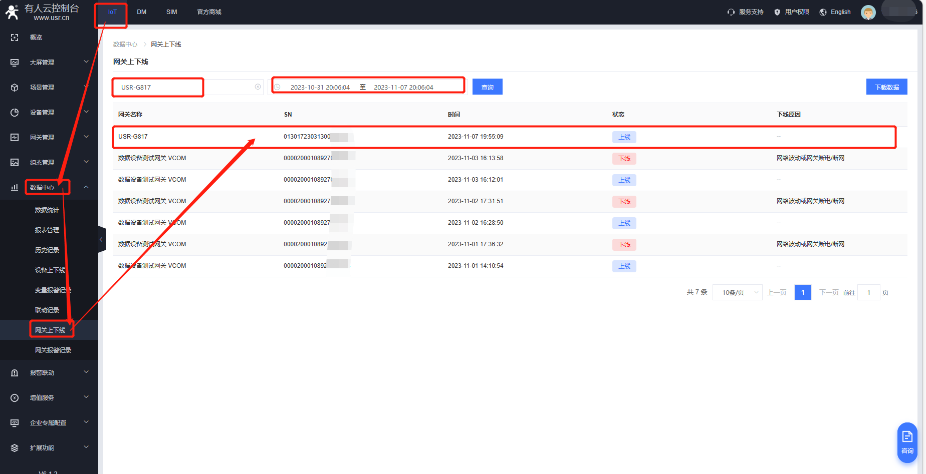 7)IOT平臺(tái)---數(shù)據(jù)中心---網(wǎng)關(guān)上下線, 可以查看某時(shí)間段本網(wǎng)關(guān)的上下線記錄