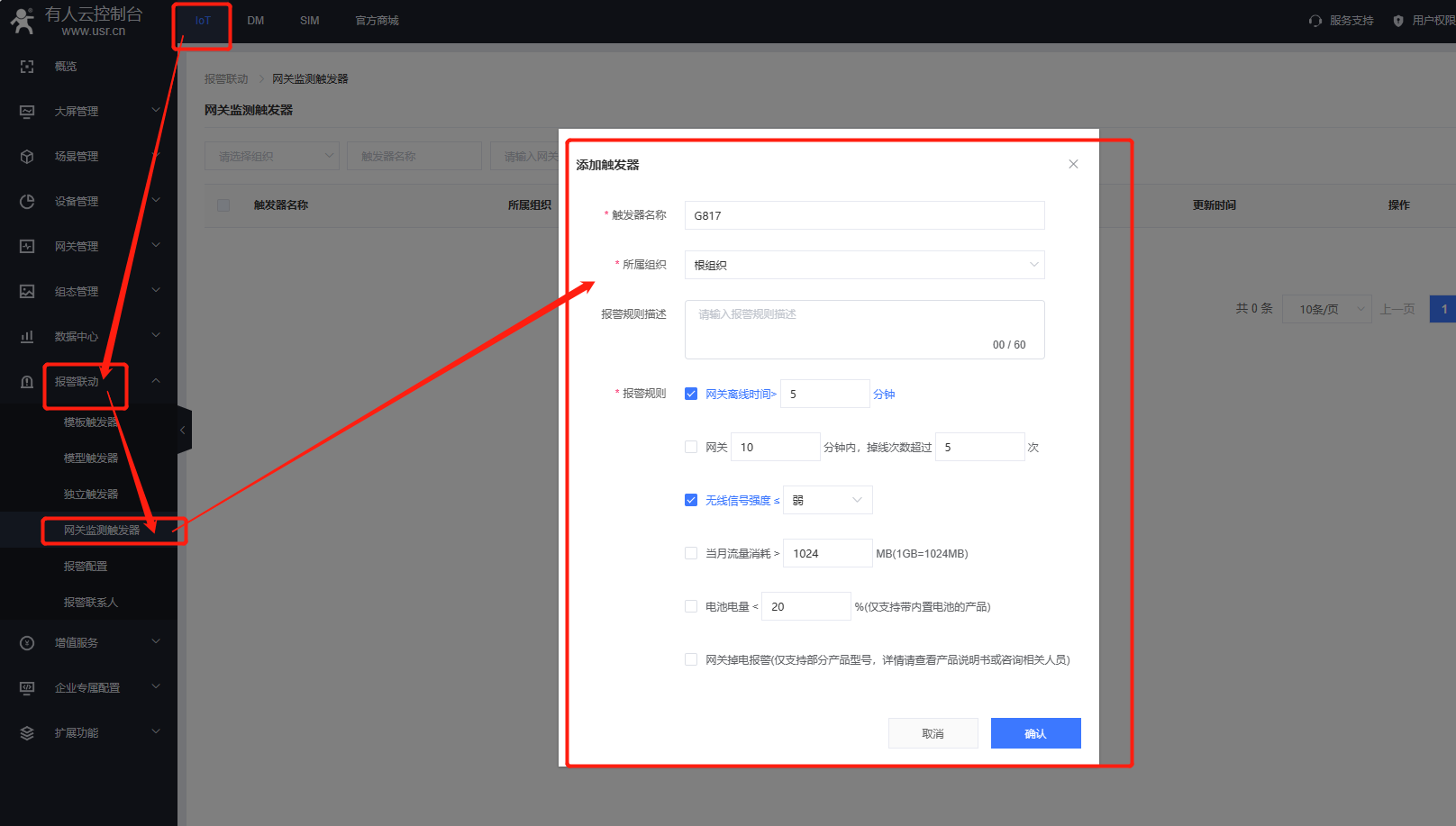 6)進(jìn)入IOT平臺(tái)---報(bào)警聯(lián)動(dòng),可以添加網(wǎng)關(guān)監(jiān)測觸發(fā)器, 此報(bào)警是網(wǎng)關(guān)自身狀況報(bào)警,一般是網(wǎng)關(guān)離線、信號(hào)強(qiáng)度過弱、流量越限等