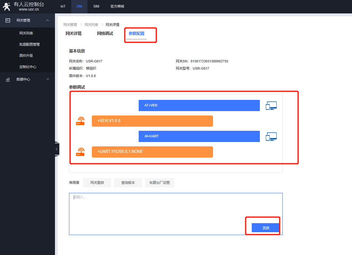 5) 在“參數(shù)配置”界面,可以輸入 AT 指令來進(jìn)行配置路由器的某些參數(shù),或者讀取路由器的某些參數(shù),并且參數(shù)的返回也會(huì)顯示在平臺(tái)上