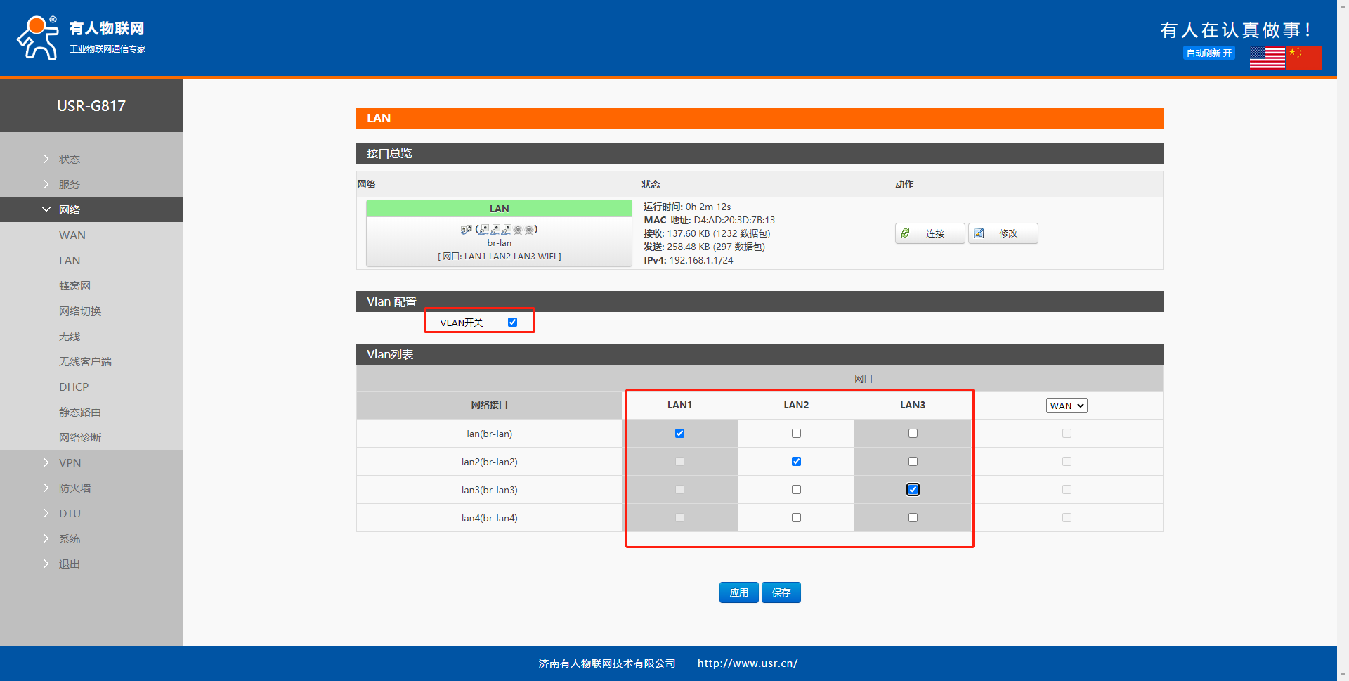 1、進入G817內(nèi)置網(wǎng)頁,進入網(wǎng)絡(luò)---LAN--使能VLAN,勾選上則開啟此功能