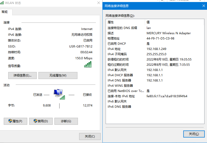 電腦自動獲取的IP為192.168.1.249,網(wǎng)關(guān)地址為:192.168.1.1即G817的LAN口IP