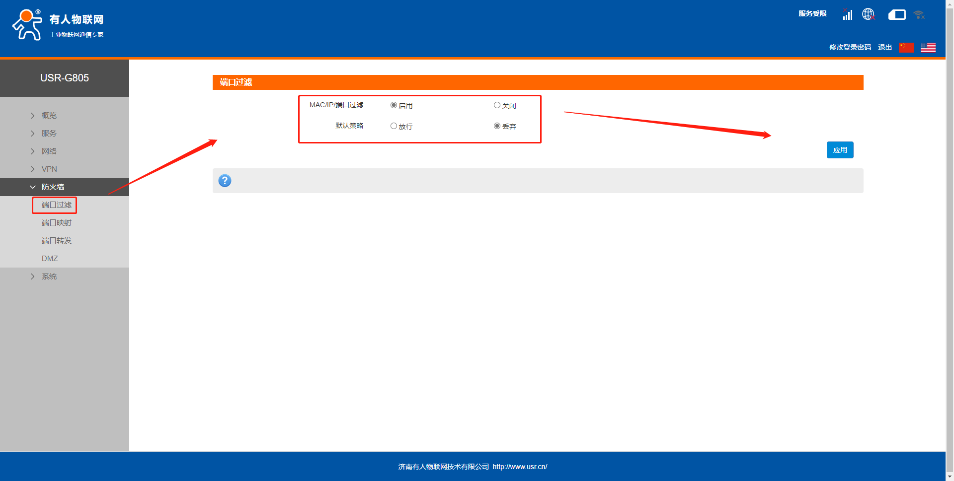 4. 在內(nèi)置網(wǎng)頁--防火墻中端口過濾界面進(jìn)行設(shè)置,啟用此功能之后點(diǎn)擊應(yīng)用。