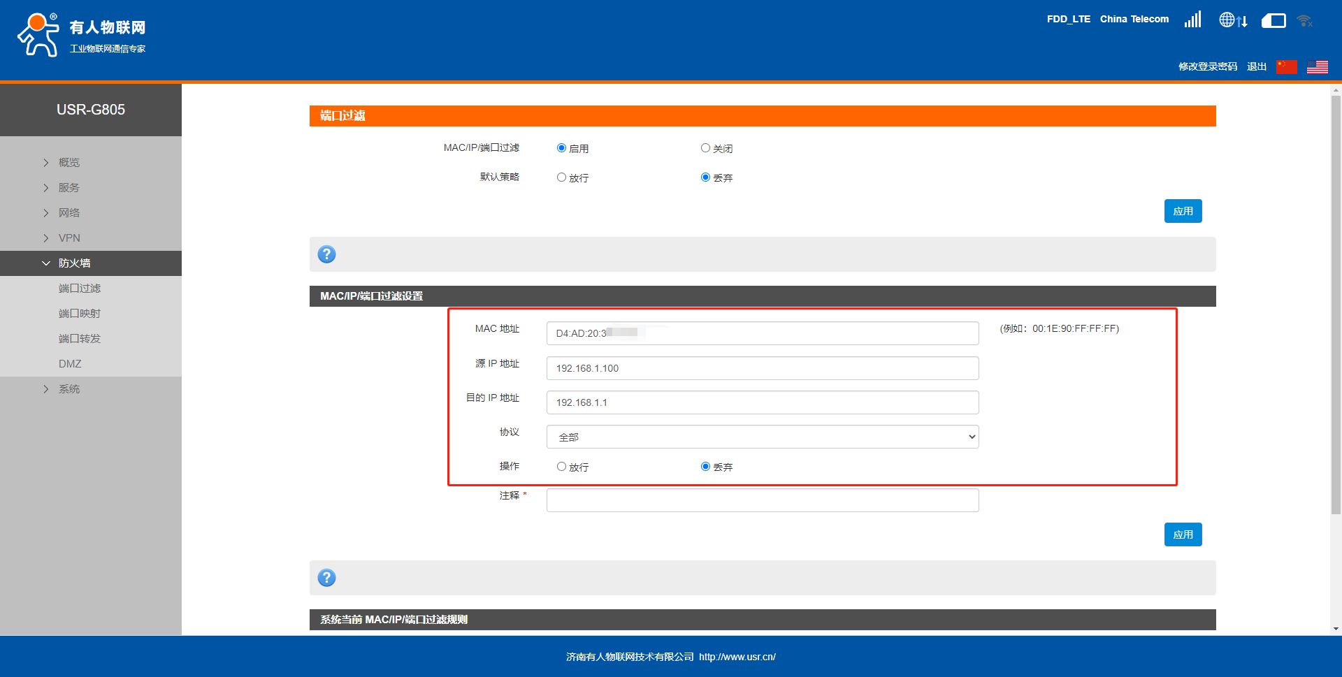 5.MAC和源IP地址設(shè)置連接805C 的下級(jí)終端的MAC和IP,目標(biāo)IP設(shè)置禁止訪問的IP,協(xié)議選擇全部,操作設(shè)置丟棄,注釋自定義填寫。