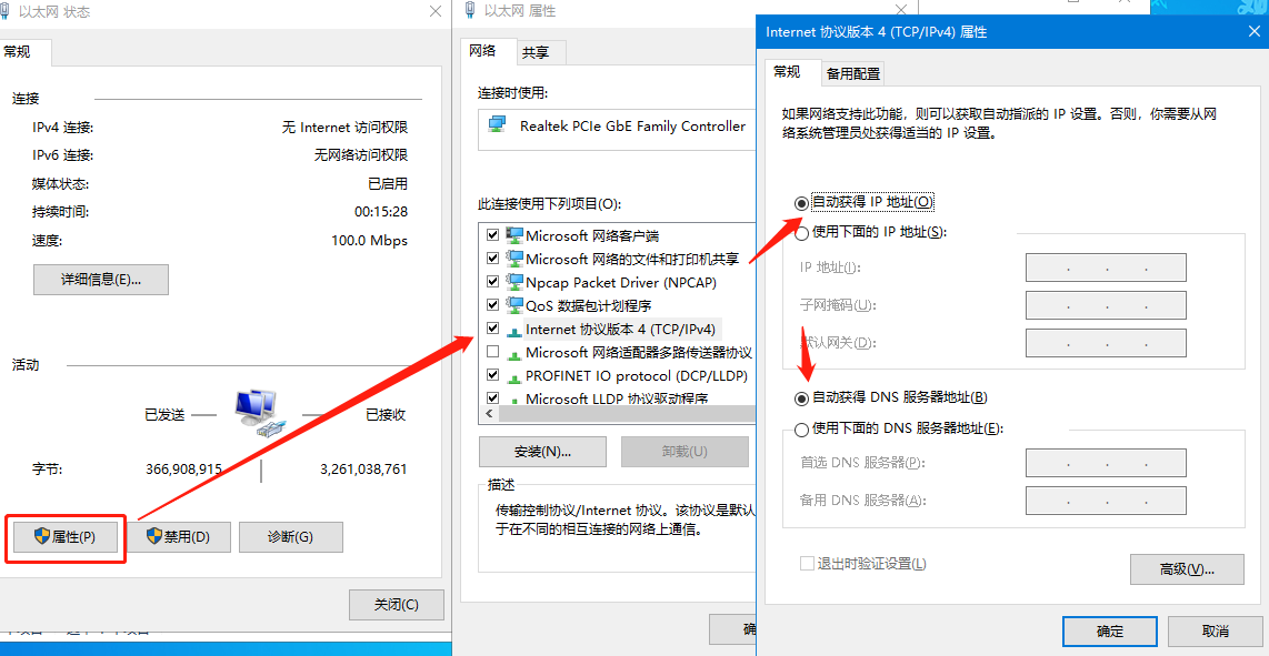 1.PC通過網(wǎng)線連接路由模塊的LAN口電腦配置網(wǎng)卡,雙擊該網(wǎng)卡選擇屬性,雙擊IPv4進(jìn)入配置界面,勾選動(dòng)態(tài)獲取之后點(diǎn)擊確定