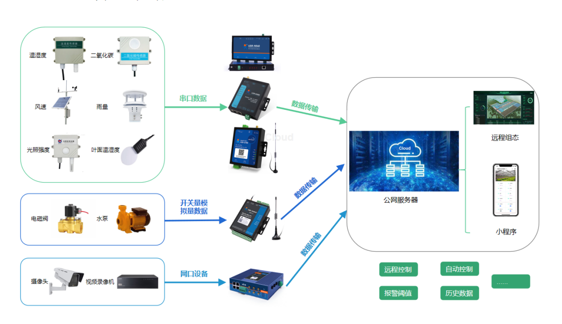 v 若現(xiàn)場終端設備為串口設備,可以通過串口服務器、wifi串口服務器或DTU將數(shù)據(jù)傳輸至遠程服務器顯示。若現(xiàn)場有4G信號時可選用DTU進行數(shù)據(jù)傳輸;若方便布線可選用串口服務器;若現(xiàn)場有wifi覆蓋可選用wifi串口服務器;