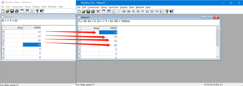 改變每個MODBUS SLAVE軟件的數(shù)據(jù),對應的MODBUS POLL軟件就可以采集到正確的數(shù)據(jù)。