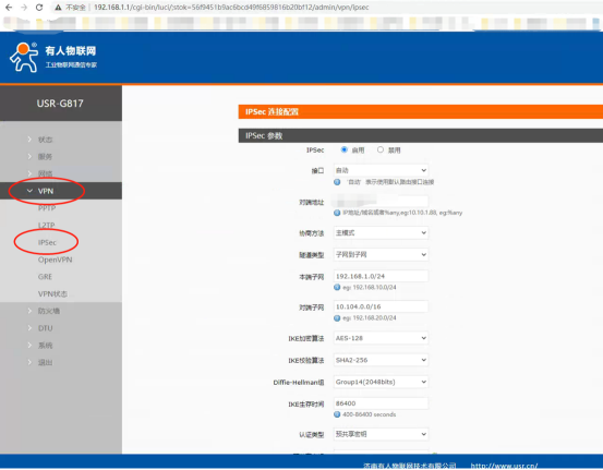 注意:飛塔服務器的對端標識必須設置為IP,服務器和路由器設置一致即可,客戶端(即USR-G817)的對端標識可以不寫。