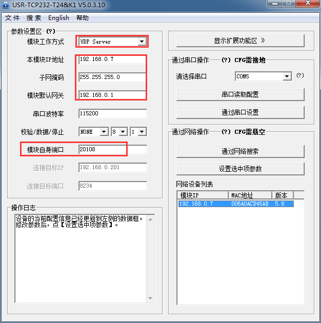 1:設(shè)置參數(shù);UDP server。自身端口為20108.