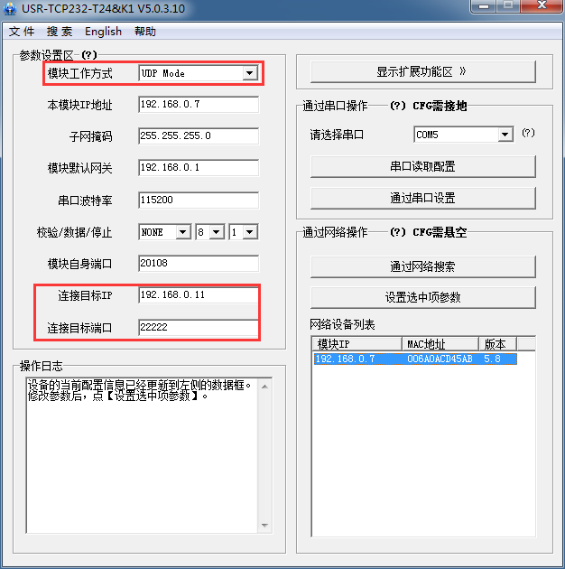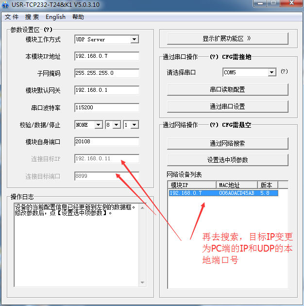 5:為了檢驗此功能,雙向發(fā)送數(shù)據(jù)測試成功以后,使用設(shè)置軟件搜索,然后查詢參數(shù),發(fā)現(xiàn)目標(biāo)IP和端口改成了192.168.0.11和8899