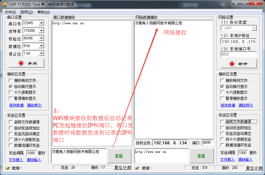 2:串口測(cè)試,將WiFi模塊連接到電腦的串口上,電腦的設(shè)置管理器上顯示為COM5.測(cè)試串口向網(wǎng)絡(luò),網(wǎng)絡(luò)向串口端的數(shù)據(jù)透?jìng)鳌?/p>