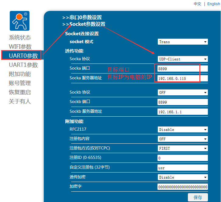 1:進(jìn)入配置網(wǎng)頁(yè),設(shè)置socka協(xié)議為UDP server,UDP server端口8899 。socka服務(wù)器地址可以設(shè)置為電腦的IP,這個(gè)服務(wù)器地址是代表WiFi模塊串口接收到數(shù)據(jù)后,將數(shù)據(jù)發(fā)送到網(wǎng)絡(luò)端,如果模塊沒(méi)有記錄來(lái)源IP和端口的話(huà),模塊自動(dòng)將數(shù)據(jù)發(fā)送到服務(wù)器地址和socka端口。設(shè)置完成后重啟WiFi模塊