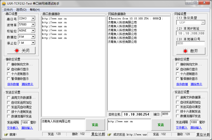 3.通信測試,串口向網(wǎng)絡(luò)發(fā)送及網(wǎng)絡(luò)向串口發(fā)送均可正常收到。