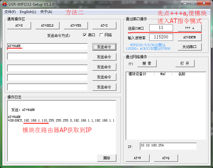 b)串口AT指令查詢,先點+++a使模塊進(jìn)入AT指令模式下,發(fā)送指令A(yù)T+WANN查詢。點擊+++a會返回+ok,如果沒有返回+ok請檢查波特率是否匹配,COM口號是否正確。使用前需要將模塊串口通過串口線連接到電腦上才能使用該方式。軟件點擊此處下載。