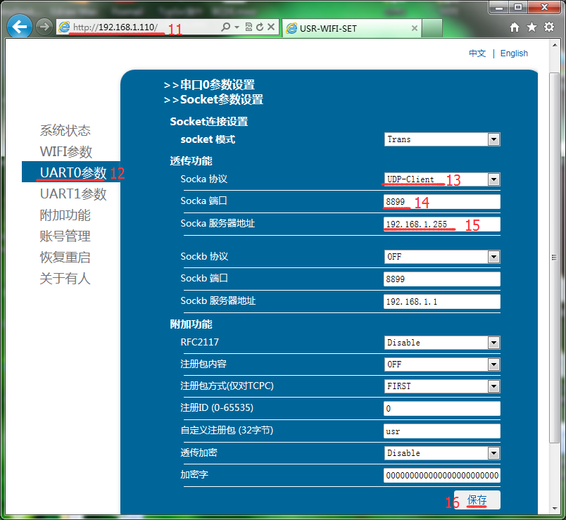 b)協(xié)議修改為UDP-Client,所有WIFI模塊的端口都需要設(shè)置相同,比如8899,服務(wù)器地址修改為192.168.1.255。因為模塊連接到的路由器網(wǎng)段為192.168.1.1,255為廣播地址。假設(shè)模塊連接到的路由器網(wǎng)段為192.168.2.1,模塊服務(wù)器地址則需要設(shè)置為192.168.2.255。