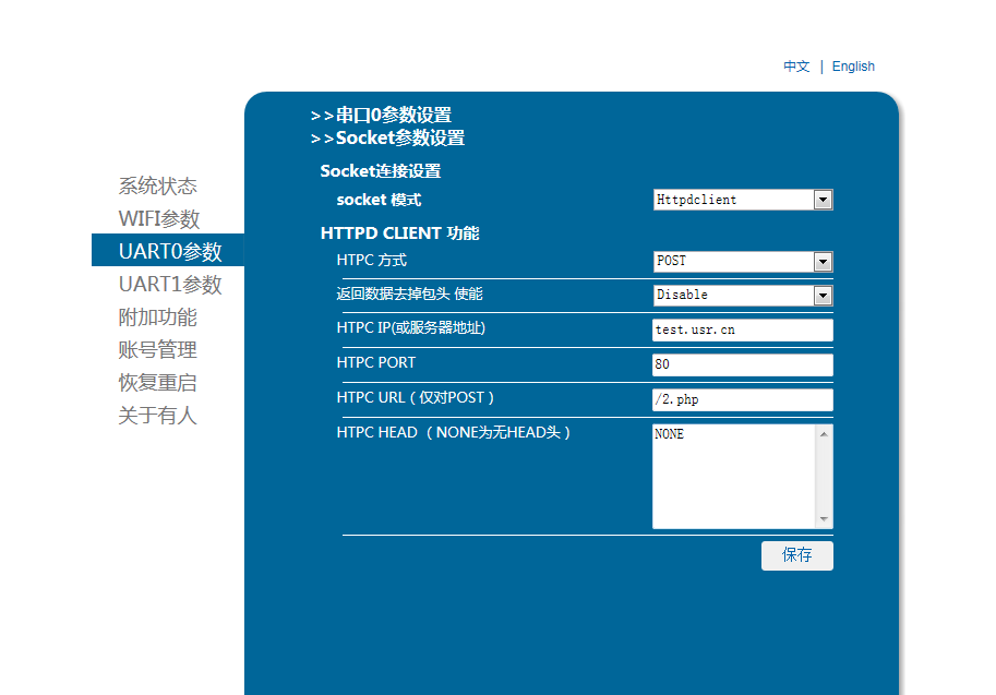 5、模塊設(shè)置參數(shù):登錄設(shè)置網(wǎng)頁,模塊設(shè)置為Httpd Client模式,請求方式,設(shè)置服務(wù)器地址,端口,保存。重啟模塊。(本說明文檔使用為有人測試服務(wù)器)