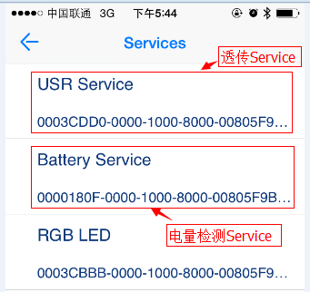 5、點(diǎn)擊需要進(jìn)行通信的藍(lán)牙名稱建立連接,此時USR-BLE100上的LINK燈變?yōu)槌A?。軟件界面如下所示,點(diǎn)擊USR Service。