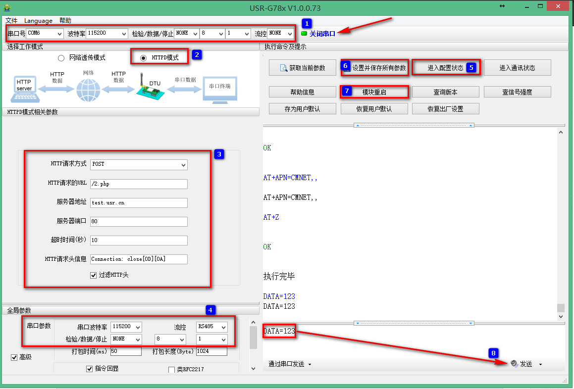 實現(xiàn)功能:實現(xiàn)串口設(shè)備發(fā)送數(shù)據(jù),通過USR-G780模塊,可以直接發(fā)送到網(wǎng)頁服務(wù)器上,網(wǎng)頁服務(wù)器可以接收數(shù)據(jù),對數(shù)據(jù)進(jìn)行判斷存儲等操作,web服務(wù)器根據(jù)串口設(shè)備請求數(shù)據(jù),反饋相應(yīng)的控制指令。