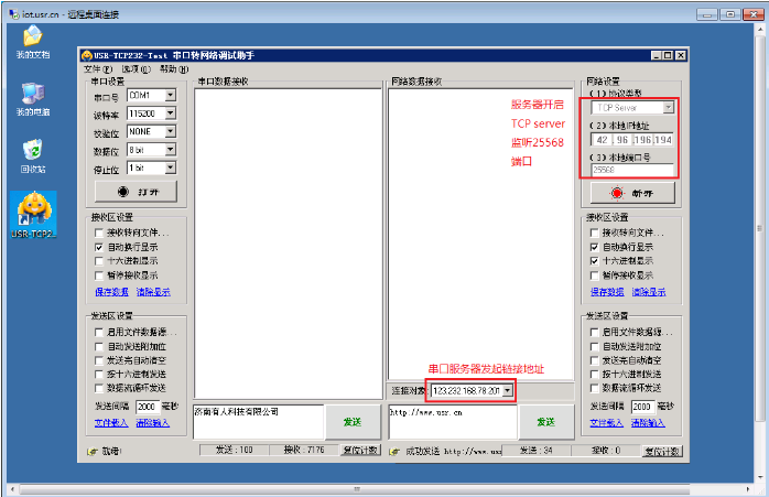 以上是服務器發(fā)送數(shù)據(jù)和接收數(shù)據(jù):以下使用電腦串口連接GPRS-DTU串口,電腦運行串口調(diào)試軟件,進行發(fā)送和接收服務器的數(shù)據(jù)。