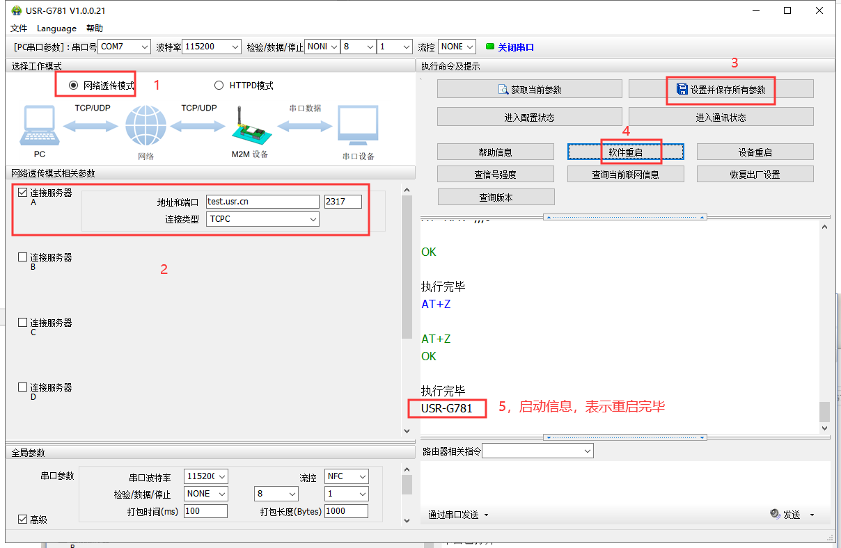 5>待重啟完畢后會(huì)在串口打印USR-G781字樣,表示設(shè)備啟動(dòng)完成。設(shè)備上的linkA指示燈常亮,表示socketA建立連接