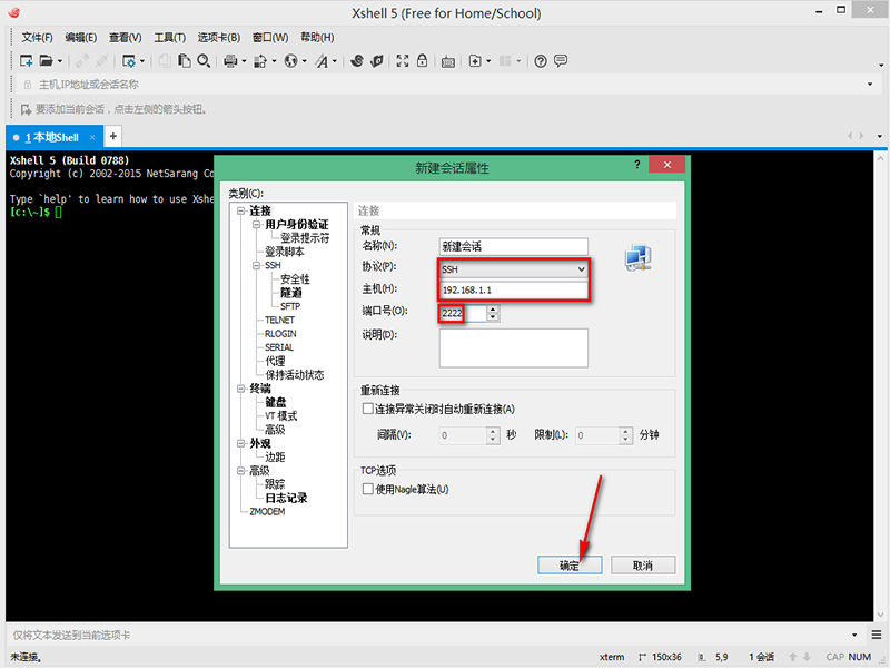 6、協(xié)議選為ssh 主機(jī)填寫192.168.1.1 端口號(hào)填寫2222,點(diǎn)擊“確定”