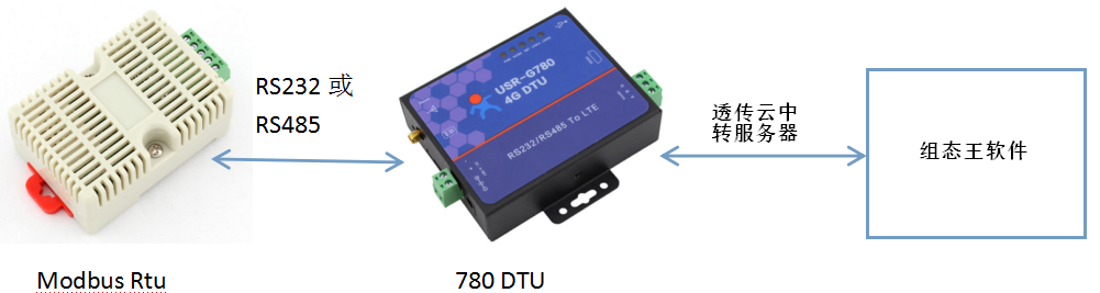 1.3實現(xiàn)功能:串口設(shè)備連接DTU,DTU設(shè)置參數(shù)后與透傳云服務(wù)器連接,組態(tài)王連接虛擬串口軟件,實現(xiàn)組態(tài)王發(fā)送MODBUS RTU協(xié)議的請求數(shù)據(jù),MODBUSRTU下位機返回對應(yīng)的參數(shù)值。