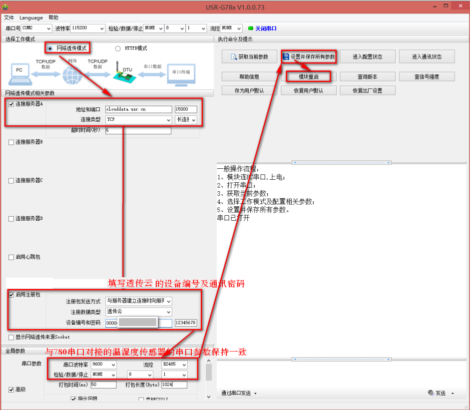 3、設(shè)置完參數(shù)后,將780串口與溫濕度傳感器對接上,連接服務(wù)器。