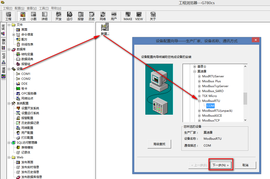 4.3點擊設(shè)備,新建一個組態(tài)設(shè)備,選擇 PLC-莫迪康-Modbus