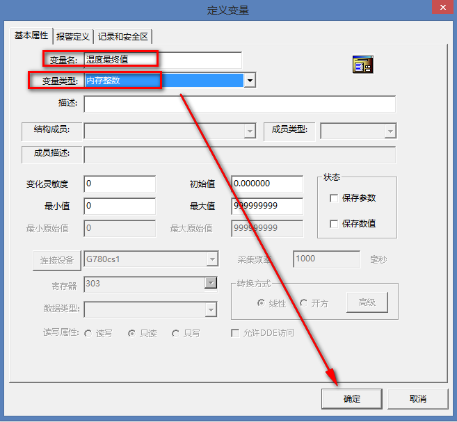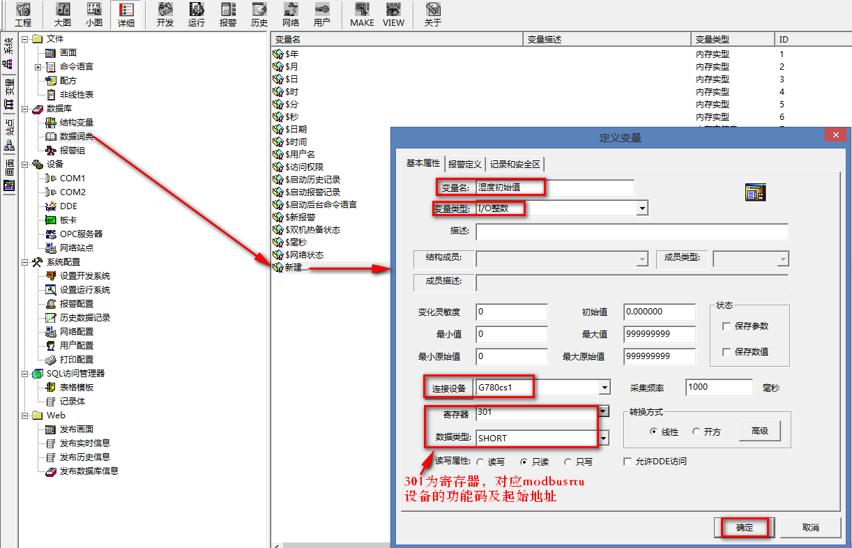 (1)新建變量名:濕度初始值,選擇變量類型:IO整數(shù),連接設(shè)備為新建的設(shè)備名:G780cs1,寄存器301,代表功能碼為04,起始地址0的第一個值。