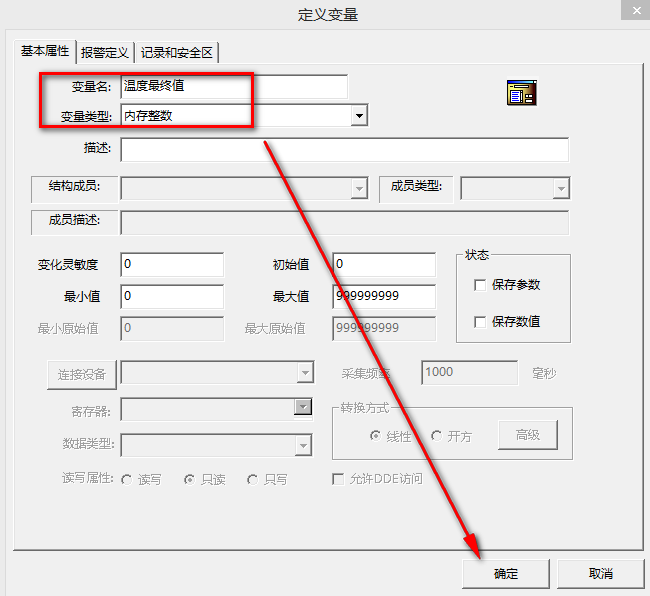 (4)新建變量名:溫度最終值,選擇變量類型“內(nèi)存整數(shù)”,點擊“確定”。