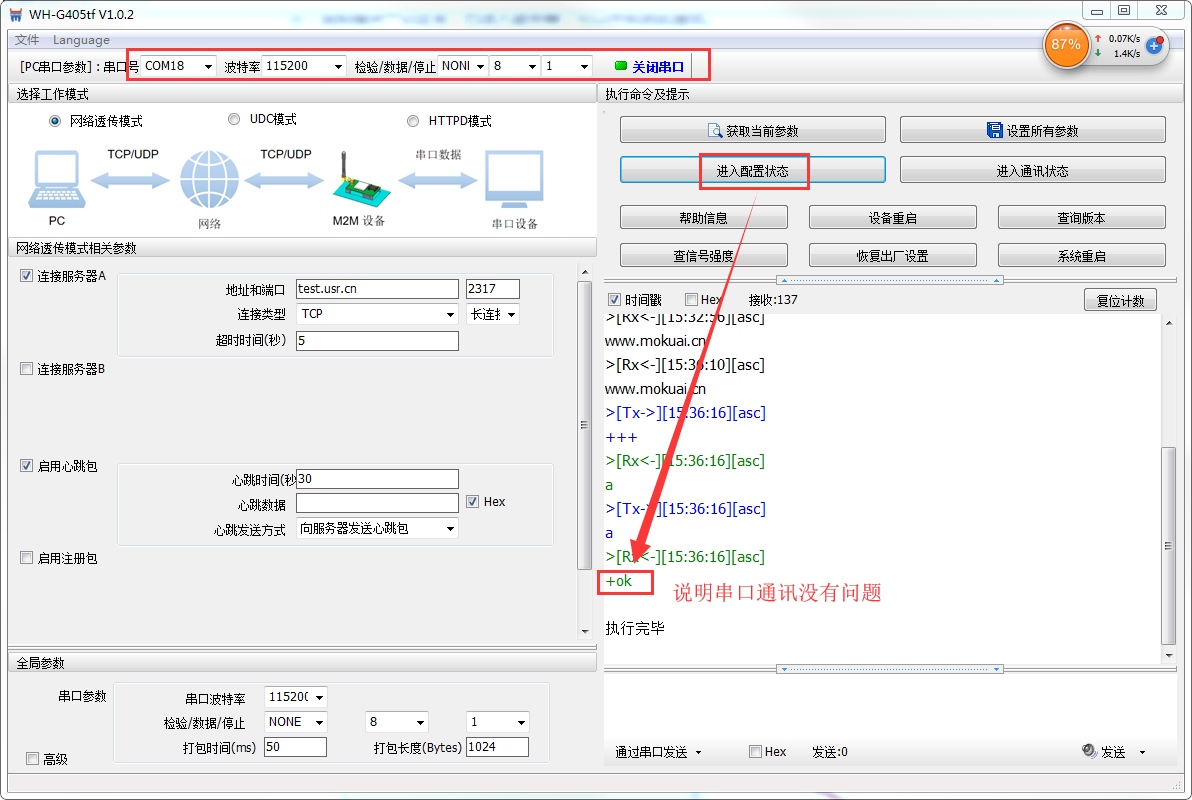 (4)打開串口后,先點擊進入配置狀態(tài),如果模塊能返回+ok的字符,說明電腦和模塊連接是沒有問題的;然后點擊進入通訊狀態(tài),做數(shù)據(jù)通訊測試。如果不返回+OK的話,請參考(步驟4)