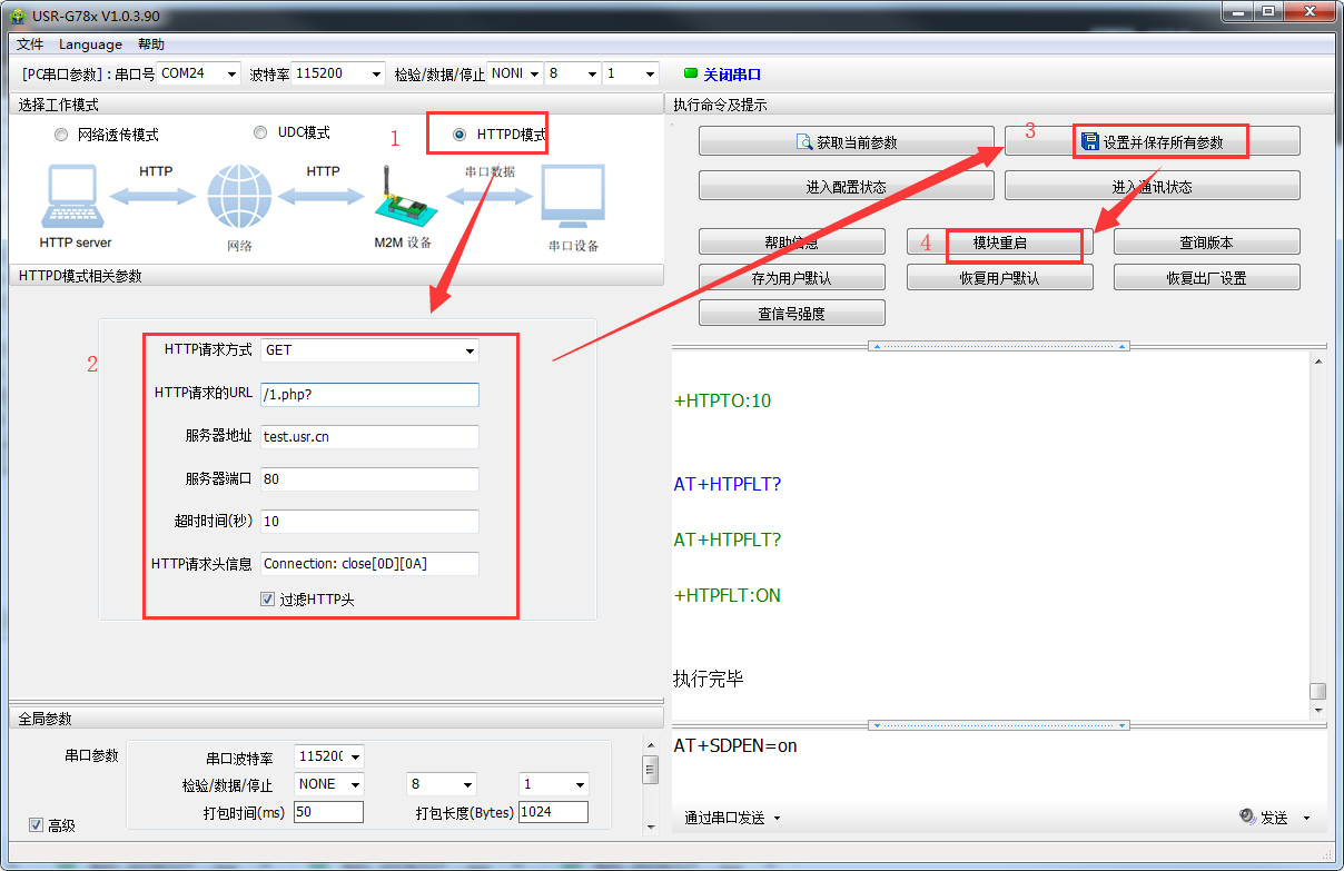 (1) 硬件連接:裝上sim卡,接上天線,780 V2的串口通過UAB轉RS232/485接到PC上,用我司提供的適配器供電。