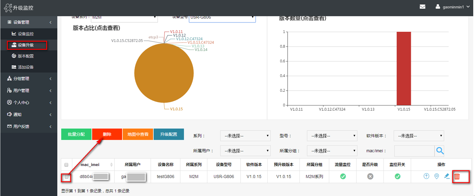 點擊“設(shè)備升級”,對于要刪除的設(shè)備,勾選前面的選擇框然后點擊“刪除”,或者是直接點擊垃圾桶圖標(biāo)進行刪除設(shè)備