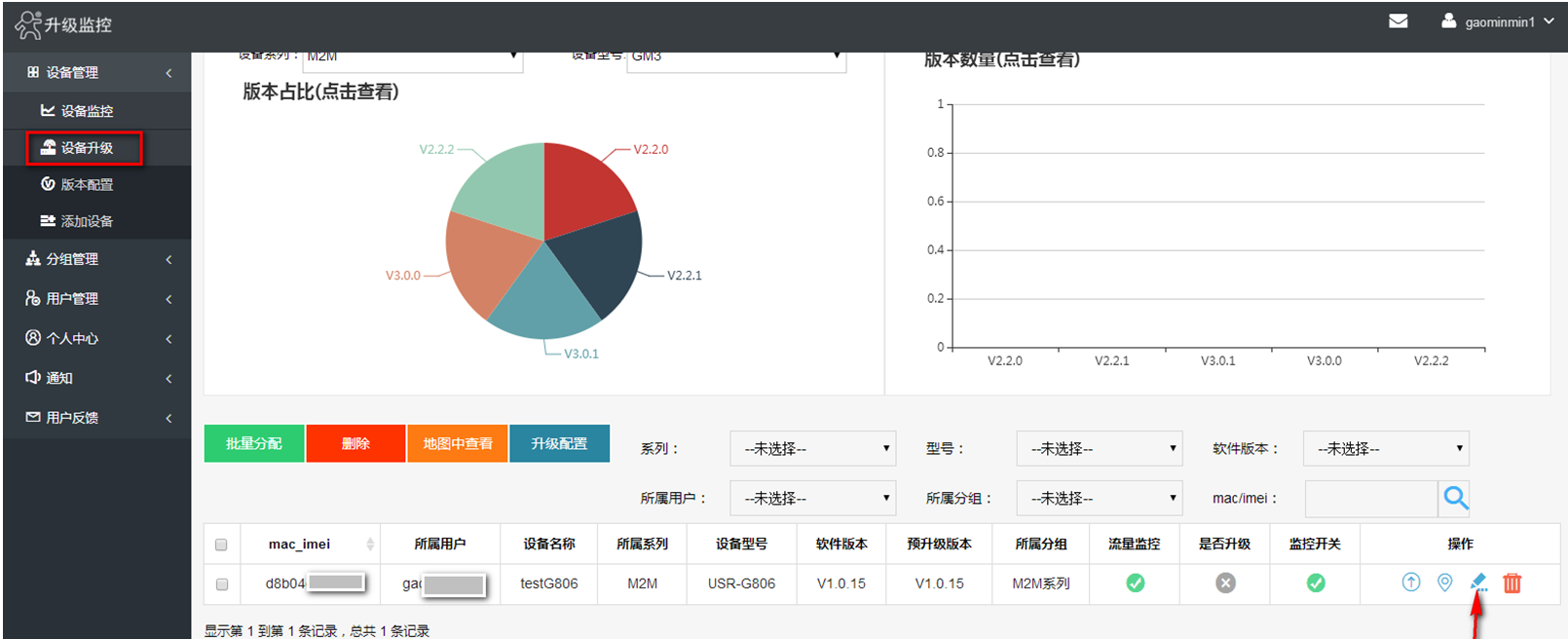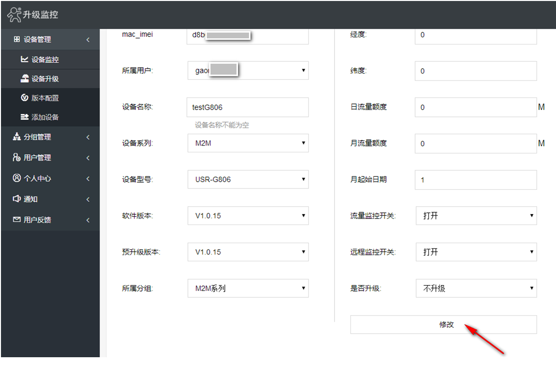 點擊“設(shè)備升級”,對于要修改的設(shè)備信息,點擊編輯按鈕,出來修改信息的界面后,直接更改,更改完后,點擊“修改”即可保存信息。