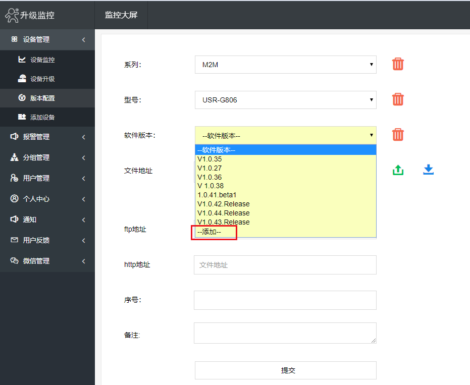 4、點擊“版本配置”,系列選擇M2M,型號按照實際情況填寫,軟件版本選擇添加--輸入自己設(shè)備目前的版本號