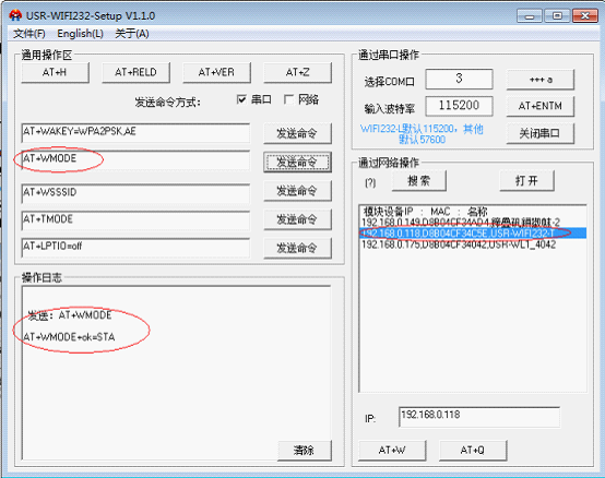 查看回顯的指令是否是AT+WMODE+ok=AP.