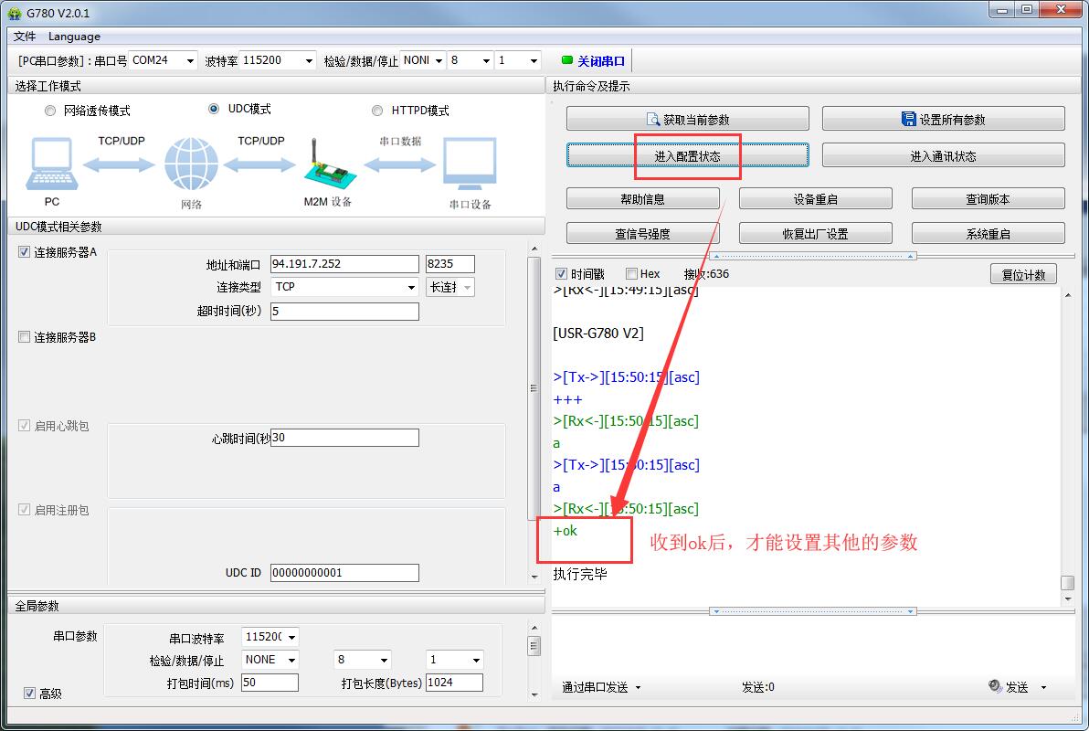 注意:設(shè)置的時(shí)候需要先點(diǎn)擊“進(jìn)入配置狀態(tài)”,收到+ok后才能設(shè)置其他參數(shù),否則需要先解決這個(gè)問(wèn)題,解決辦法參考