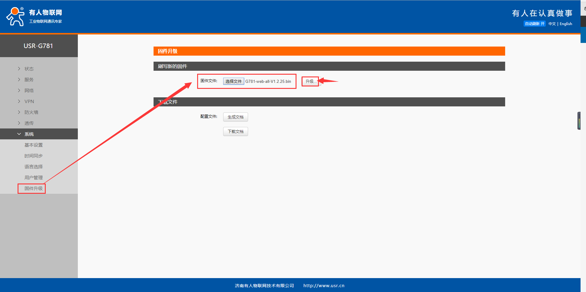 4、 進(jìn)入系統(tǒng)----固件升級(jí)界面,選擇對(duì)應(yīng)的固件文件(請(qǐng)登錄http://h.usr.cn/提交工單并備注當(dāng)前固件版本和郵箱地址,技術(shù)支持會(huì)將固件文件發(fā)送至您的郵箱),點(diǎn)擊升級(jí),會(huì)提示正在升級(jí)。此時(shí)不要重啟設(shè)備,不要斷電,耐心等待約一分鐘左右。設(shè)備升級(jí)固件完成后會(huì)自動(dòng)重啟(可觀察指示燈)。