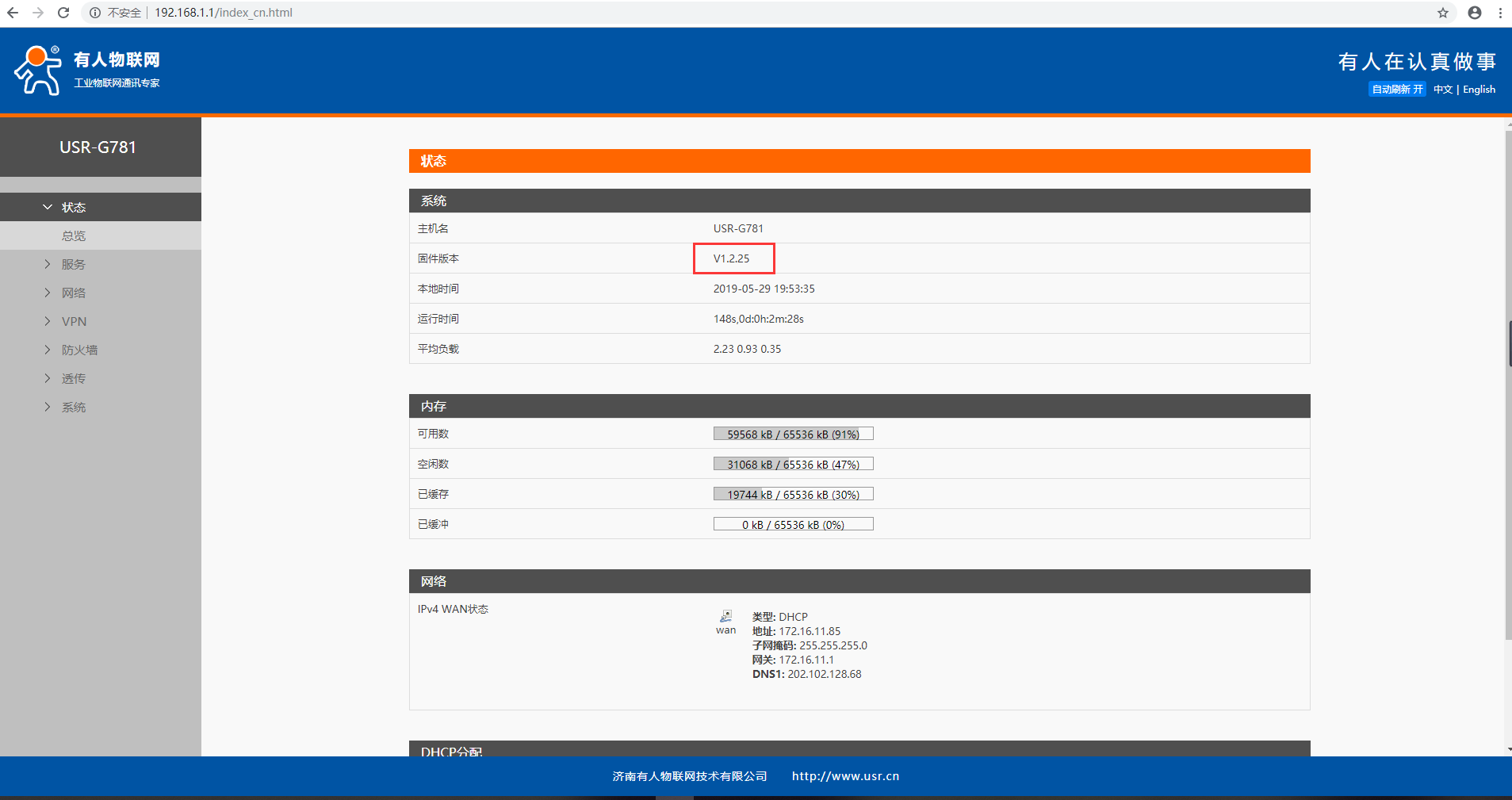 5、 等待設(shè)備升級(jí)固件完畢自動(dòng)重啟完成后,重新進(jìn)入配置網(wǎng)頁(yè),可在狀態(tài)總覽頁(yè)面查看到固件版本已經(jīng)更改