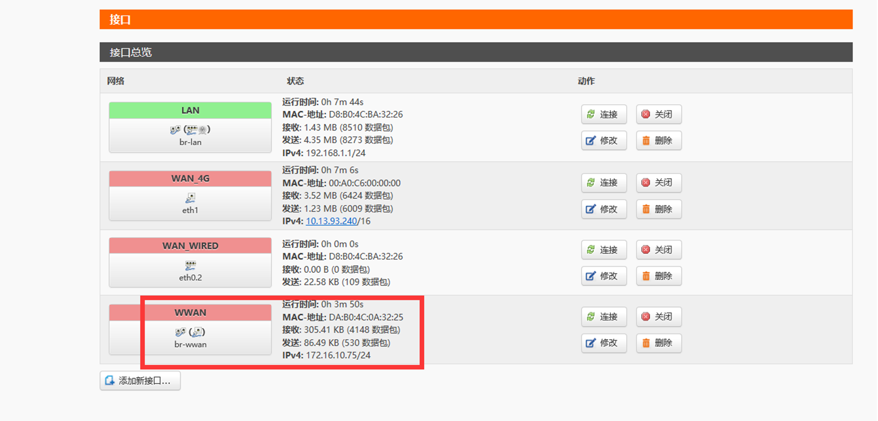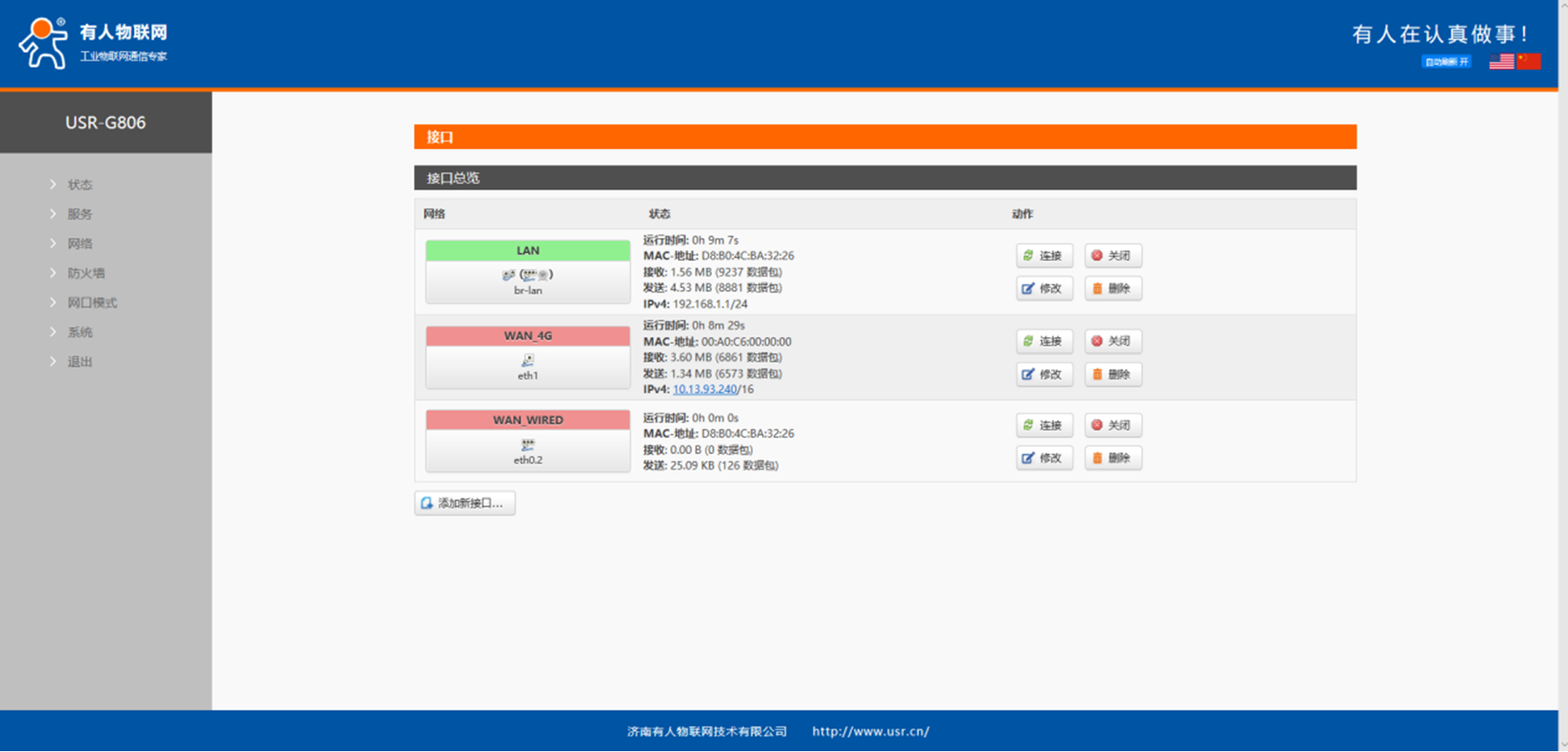 3、 打開(kāi)瀏覽器,地址欄輸入192.168.1.1,進(jìn)入G806的設(shè)置網(wǎng)頁(yè),用戶名密碼都是root(注意:不要使用360瀏覽器),點(diǎn)擊網(wǎng)絡(luò)---接口界面,可以看到當(dāng)前有三個(gè)接口,LAN、WAN-4G、WAN-WIRED,分別是局域網(wǎng)接口,4G接口,有線網(wǎng)接口。(注意:LAN接口網(wǎng)段和其他的WAN接口IP網(wǎng)段不能沖突。)