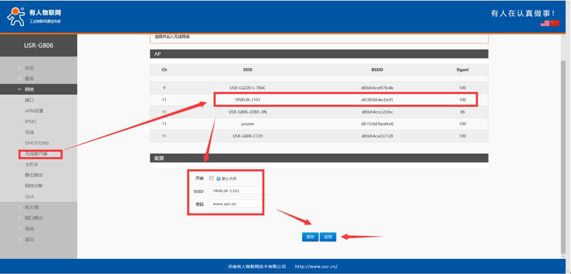若此時(shí)看不到該接口獲取到的IP以及上下行數(shù)據(jù),可以嘗試多次點(diǎn)擊網(wǎng)絡(luò)—無(wú)線客戶端界面的應(yīng)用按鈕,并嘗試重啟,待設(shè)備重啟后,等待片刻,查看接口是否獲取到IP。一般情況下經(jīng)過(guò)以上操作便可鏈接。