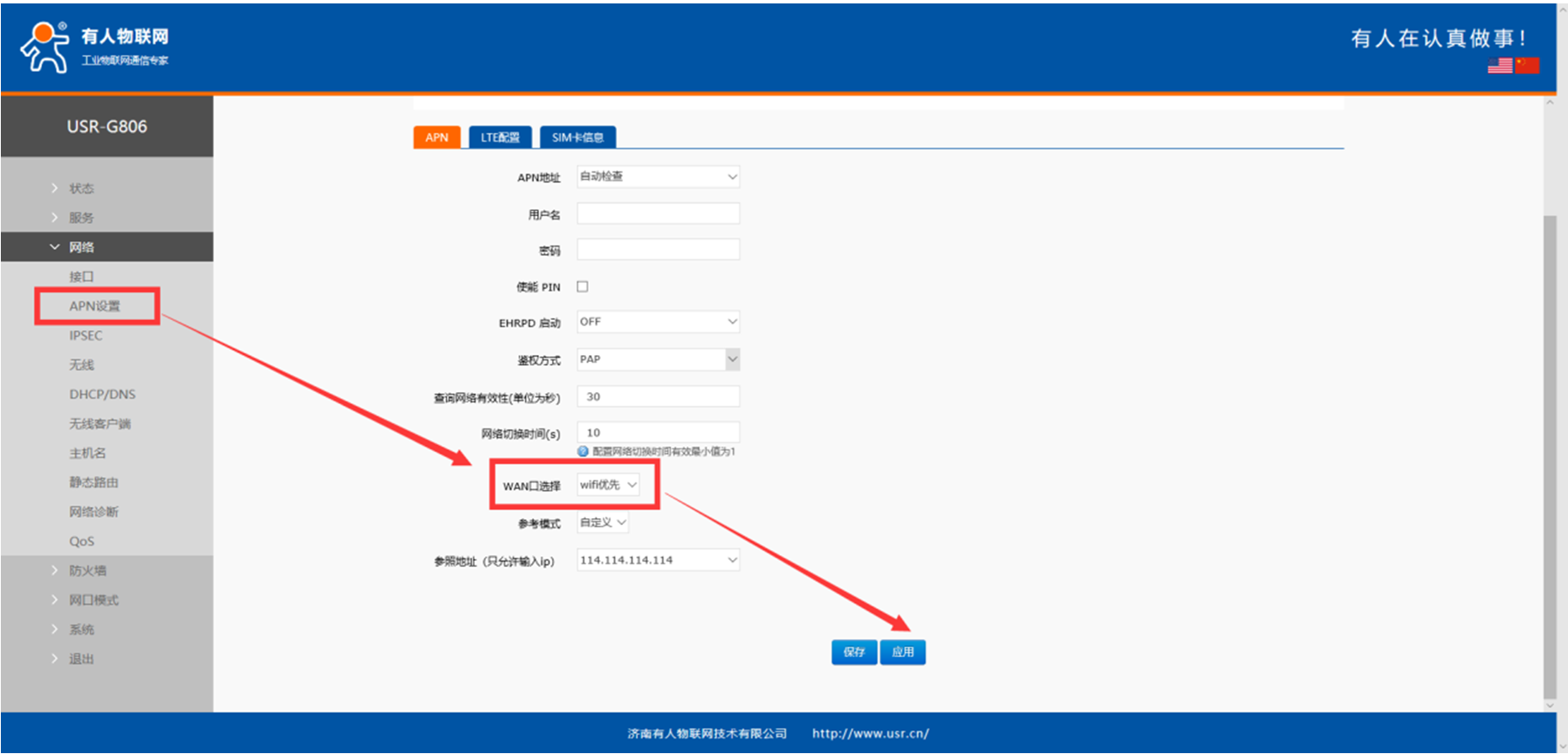 5、 在網(wǎng)絡(luò)---APN設(shè)置界面選擇WiFi優(yōu)先,并應(yīng)用,設(shè)備則會(huì)優(yōu)先選擇WiFi上網(wǎng)(默認(rèn)有線優(yōu)先)