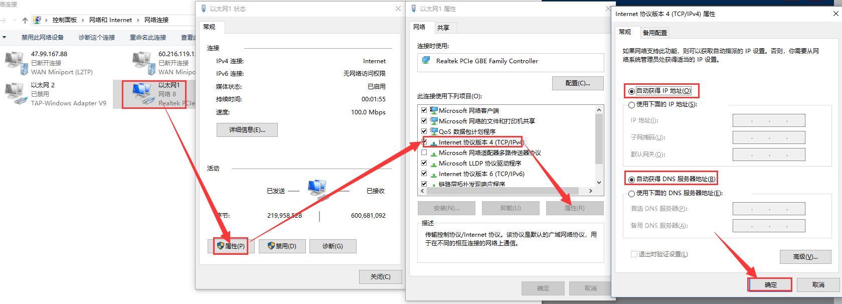 (3)打開網(wǎng)絡(luò)共享中心,雙擊對應(yīng)的網(wǎng)絡(luò)適配器,點擊屬性,選擇IPV4,點擊屬性,修改電腦為自動獲取IP,然后點擊確定。(如果電腦本來就是自動獲取IP,這一步可以跳過)點擊詳細(xì)信息可以查看到電腦獲取的IP地址: